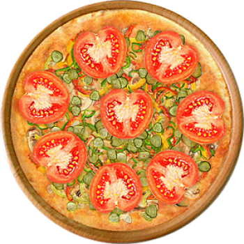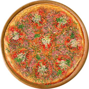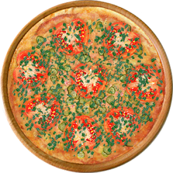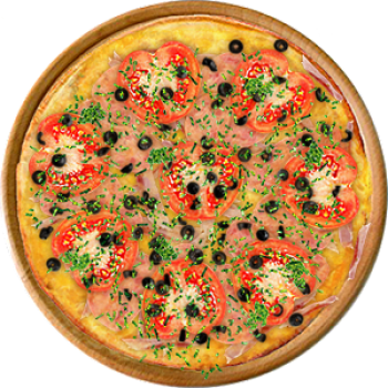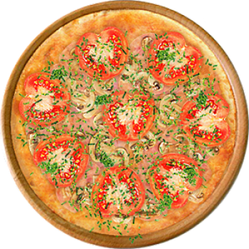 Основа: Традиционная (толстое тесто ⌀35см) (650 г) Соус: Соус красный (100 г) Топпинги: Балык (50 г), Ветчина (50 г), Шампиньоны (50 г), Сыр (50 г), Помидоры (50 г) Доп. топпинги: Зелень (10 г)