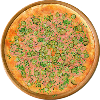 Основа: Традиционная (толстое тесто ⌀35см) (650 г) Соус: Соус красный (100 г) Топпинги: Балык (50 г), Ветчина (50 г), Сыр (50 г), Огурчики (50 г) Доп. топпинги: Зелень (10 г)