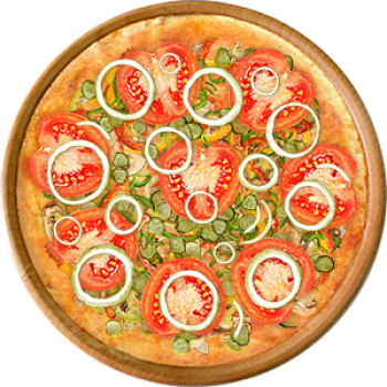 Основа: Традиционная (толстое тесто ⌀35см) (650 г) Соус: Соус красный (100 г) Топпинги: Курица копченая (50 г), Шампиньоны (50 г), Болгарский перец (50 г), Огурчики (50 г), Помидоры (50 г), Сыр (100 г) Доп. топпинги: Лук репчатый (35 г)
