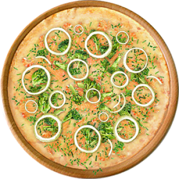 Основа: Традиционная (толстое тесто ⌀35см) (650 г) Соус: Соус белый (100 г) Топпинги: Креветки (50 г), Брокколи (50 г), Лосось (100 г), Сырное ассорти (100 г) Доп. топпинги: Зелень (10 г), Лук репчатый (35 г)