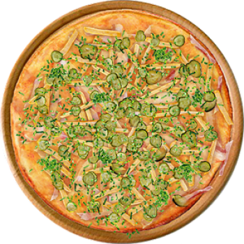 Основа: Итальянская (тонкое тесто ⌀35см) (400 г) Соус: Соус красный (100 г) Топпинги: Бекон (50 г), Грудинка (50 г), Сырное ассорти (50 г), Картофель фри (50 г), Огурчики (50 г) Доп. топпинги: Зелень (10 г)
