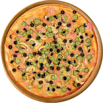 Основа: Итальянская (тонкое тесто ⌀35см) (400 г) Соус: Соус красный (100 г) Топпинги: Ветчина (50 г), Копченые колбаски (50 г), Шампиньоны (50 г), Сырное ассорти (50 г), Огурчики (50 г), Маслины (50 г) Доп. топпинги: - нет -