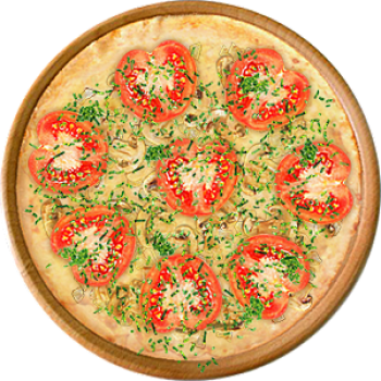 Основа: Традиционная (толстое тесто ⌀35см) (650 г) Соус: Соус белый (100 г) Топпинги: Курица копченая (50 г), Шампиньоны (50 г), Сырное ассорти (50 г), Помидоры (100 г) Доп. топпинги: Зелень (10 г)