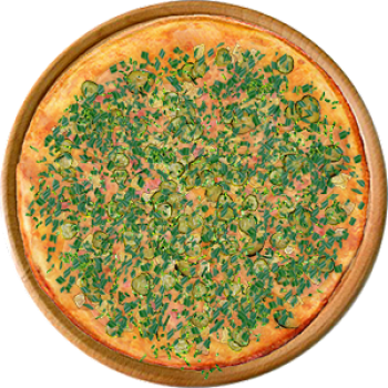Основа: Итальянская (тонкое тесто ⌀35см) (400 г) Соус: Соус красный (100 г) Топпинги: Балык (50 г), Ветчина (50 г), Курица копченая (50 г), Сырное ассорти (50 г), Огурчики (50 г) Доп. топпинги: Зелень (10 г), Лук зелёный (20 г)