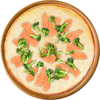 Основа: Итальянская (тонкое тесто ⌀35см) (400 г) Соус: Соус белый (100 г) Топпинги: Лосось (50 г), Брокколи (100 г) Доп. топпинги: - нет -