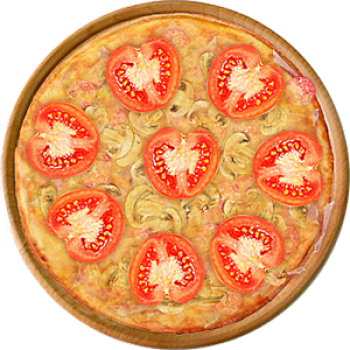 Основа: Итальянская (тонкое тесто ⌀35см) (400 г) Соус: Соус красный (100 г) Топпинги: Бекон (50 г), Ветчина (50 г), Копченые колбаски (50 г), Шампиньоны (50 г), Сыр (50 г), Сырное ассорти (50 г), Помидоры (50 г) Доп. топпинги: - нет -