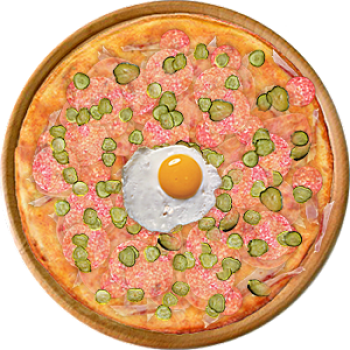 Основа: Итальянская (тонкое тесто ⌀35см) (400 г) Соус: Соус красный (100 г) Топпинги: Бекон (50 г), Ветчина (50 г), Копченые колбаски (50 г), Салями (50 г), Сыр (50 г), Огурчики (50 г), Яйцо куриное (50 г) Доп. топпинги: - нет -