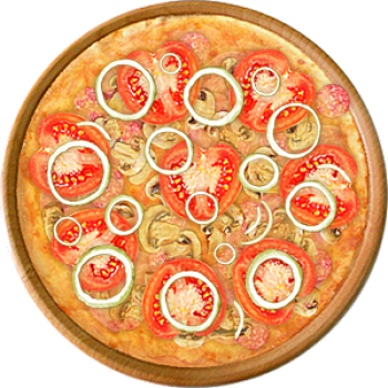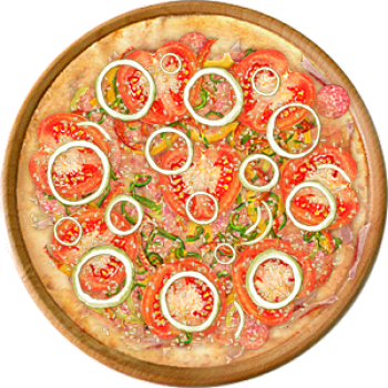 Основа: Традиционная (толстое тесто ⌀35см) (650 г) Соус: Соус красный (100 г) Топпинги: Ветчина (50 г), Копченые колбаски (50 г), Шампиньоны (50 г), Сырное ассорти (50 г), Помидоры (50 г) Доп. топпинги: Лук репчатый (35 г)