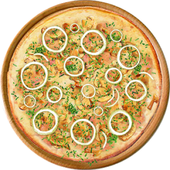 Основа: Итальянская (тонкое тесто ⌀35см) (400 г) Соус: Соус белый (100 г) Топпинги: Ветчина (50 г), Грибное ассорти (50 г), Сырное ассорти (50 г) Доп. топпинги: Зелень (10 г), Лук репчатый (35 г)