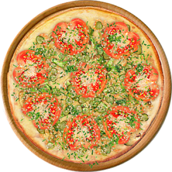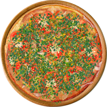Основа: Итальянская (тонкое тесто ⌀35см) (400 г) Соус: Соус красный (100 г) Топпинги: Бекон (50 г), Курица копченая (50 г), Сырное ассорти (50 г), Ветчина (100 г), Помидоры (100 г) Доп. топпинги: Зелень (10 г)