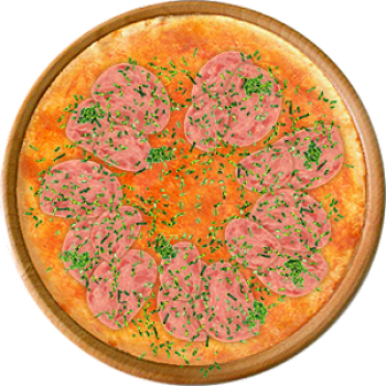 Основа: Традиционная (толстое тесто ⌀35см) (650 г) Соус: Соус красный (100 г) Топпинги: Ветчина (50 г) Доп. топпинги: Зелень (10 г)