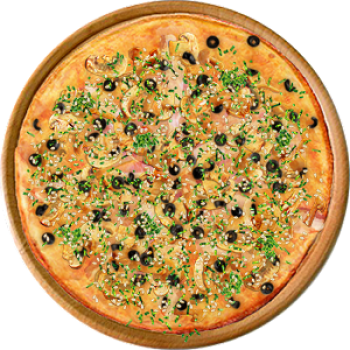Основа: Итальянская (тонкое тесто ⌀35см) (400 г) Соус: Соус красный (100 г) Топпинги: Балык (50 г), Грудинка (50 г), Грибное ассорти (50 г), Сырное ассорти (50 г), Маслины (50 г) Доп. топпинги: Зелень (10 г), Кунжут (10 г)