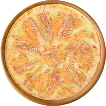 Основа: Традиционная (толстое тесто ⌀35см) (650 г) Соус: Соус белый (100 г) Топпинги: Креветки (50 г), Лосось (50 г), Окунь (филе) (50 г), Сырное ассорти (100 г) Доп. топпинги: - нет -