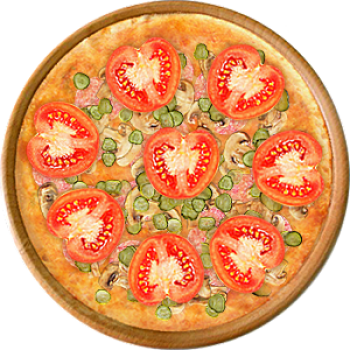 Основа: Традиционная (толстое тесто ⌀35см) (650 г) Соус: Соус красный (100 г) Топпинги: Балык (50 г), Ветчина (50 г), Сыр (50 г), Помидоры (50 г) Доп. топпинги: - нет -