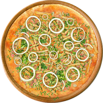 Основа: Итальянская (тонкое тесто ⌀35см) (400 г) Соус: Соус красный (100 г) Топпинги: Ветчина (50 г), Грибное ассорти (50 г), Сырное ассорти (50 г) Доп. топпинги: Зелень (10 г), Лук репчатый (35 г)