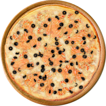 Основа: Итальянская (тонкое тесто ⌀35см) (400 г) Соус: Соус белый (100 г) Топпинги: Креветки (50 г), Лосось (50 г), Сыр (50 г), Маслины (50 г) Доп. топпинги: - нет -