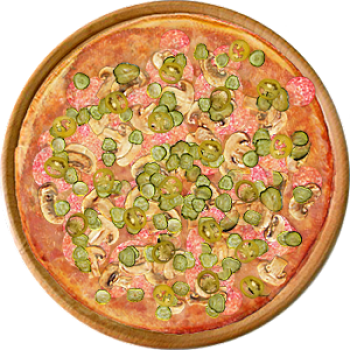 Основа: Традиционная (толстое тесто ⌀35см) (650 г) Соус: Соус красный (100 г) Топпинги: Салями (50 г), Шампиньоны (50 г), Сыр (50 г), Огурчики (50 г), Помидоры (50 г) Доп. топпинги: - нет -