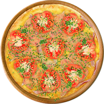 Основа: Традиционная (толстое тесто ⌀35см) (650 г) Соус: Соус сырный (100 г) Топпинги: Бекон (100 г), Ветчина (100 г), Сырное ассорти (100 г), Помидоры (100 г) Доп. топпинги: Зелень (10 г)