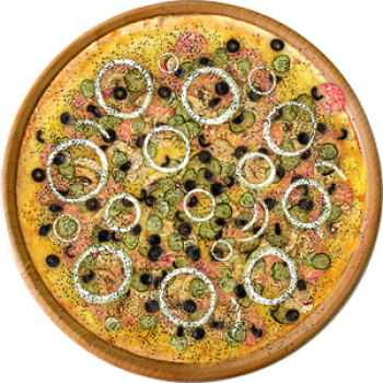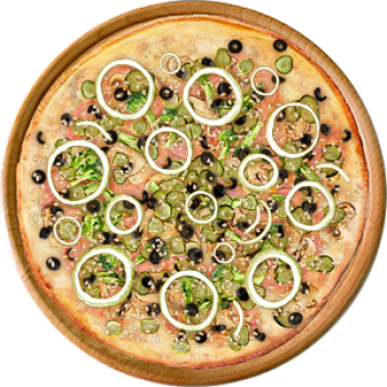 Основа: Итальянская (тонкое тесто ⌀35см) (400 г) Соус: Соус белый (100 г) Топпинги: Балык (50 г), Ветчина (50 г), Шампиньоны (50 г), Сыр (50 г), Брокколи (50 г), Огурчики (50 г), Маслины (50 г) Доп. топпинги: Кунжут (10 г), Лук репчатый (35 г)