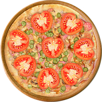 Основа: Традиционная (толстое тесто ⌀35см) (650 г) Соус: Соус красный (100 г) Топпинги: Бекон (50 г), Копченые колбаски (50 г), Салями (50 г), Сырное ассорти (50 г), Помидоры (50 г) Доп. топпинги: - нет -