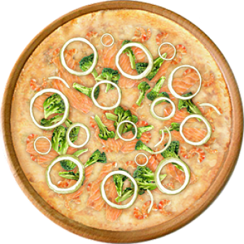 Основа: Традиционная (толстое тесто ⌀35см) (650 г) Соус: Соус белый (100 г) Топпинги: Креветки (50 г), Брокколи (50 г), Лосось (100 г), Сыр (100 г) Доп. топпинги: Лук репчатый (35 г)