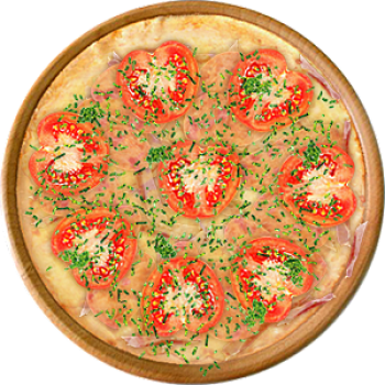 Основа: Традиционная (толстое тесто ⌀35см) (650 г) Соус: Соус белый (100 г) Топпинги: Бекон (100 г), Ветчина (100 г), Сырное ассорти (100 г), Помидоры (100 г) Доп. топпинги: Зелень (10 г)