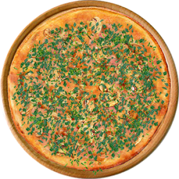 Основа: Итальянская (тонкое тесто ⌀35см) (400 г) Соус: Соус красный (100 г) Топпинги: Ветчина (50 г), Грибное ассорти (50 г), Сыр (50 г) Доп. топпинги: Зелень (10 г), Лук зелёный (20 г)