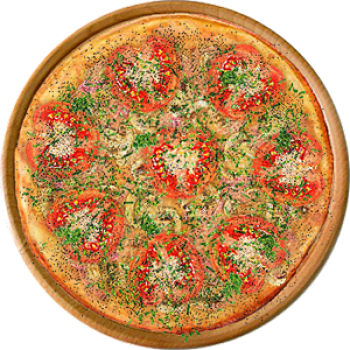 Основа: Итальянская (тонкое тесто ⌀35см) (400 г) Соус: Соус красный (100 г) Топпинги: Ветчина (50 г), Салями (50 г), Шампиньоны (50 г), Помидоры (50 г), Сырное ассорти (100 г) Доп. топпинги: Зелень (10 г), Чёрный перец (10 г)