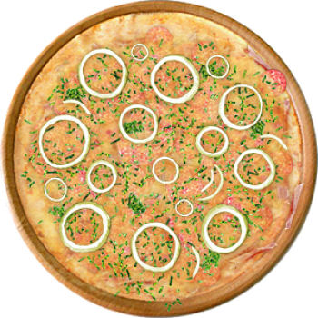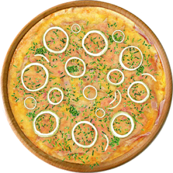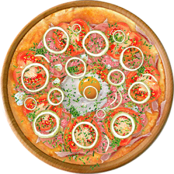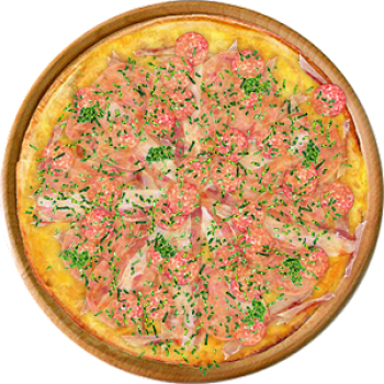 Основа: Традиционная (толстое тесто ⌀35см) (650 г) Соус: Соус белый (100 г) Топпинги: Бекон (50 г), Ветчина (50 г), Копченые колбаски (50 г), Салями (50 г), Сыр (50 г), Сырное ассорти (50 г) Доп. топпинги: Зелень (10 г), Лук репчатый (35 г)