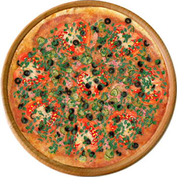 Основа: Традиционная (толстое тесто ⌀35см) (650 г) Соус: Соус чили (100 г) Топпинги: Огурчики (50 г), Помидоры (50 г), Маслины (50 г), Салями (150 г), Сыр (150 г) Доп. топпинги: Лук зелёный (20 г)