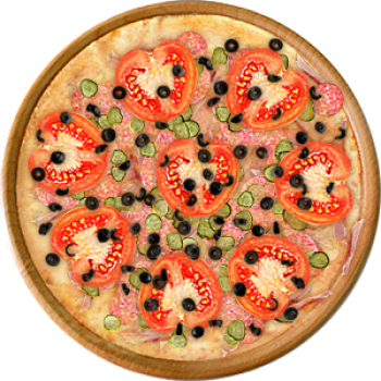 Основа: Традиционная (толстое тесто ⌀35см) (650 г) Соус: Соус белый (100 г) Топпинги: Балык (50 г), Бекон (50 г), Копченые колбаски (50 г), Салями (50 г), Сыр (50 г), Огурчики (50 г), Помидоры (50 г), Маслины (50 г) Доп. топпинги: - нет -
