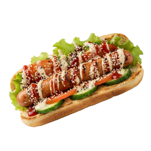 Булочка для хот-дога, жареная сосиска,сырный соус,кетчуп,салат,пеперони,кунжут =)