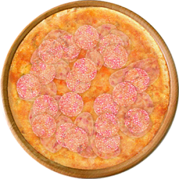 Основа: Традиционная (толстое тесто ⌀35см) (650 г) Соус: Соус красный (100 г) Топпинги: Салями (50 г), Ветчина (100 г), Сыр (100 г) Доп. топпинги: - нет -