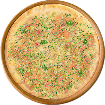Основа: Традиционная (толстое тесто ⌀35см) (650 г) Соус: Соус белый (100 г) Топпинги: Ветчина (50 г), Курица копченая (50 г), Сырное ассорти (50 г) Доп. топпинги: Зелень (10 г), Кунжут (10 г)