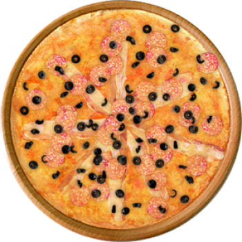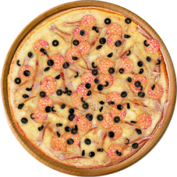 Основа: Традиционная (толстое тесто ⌀35см) (650 г) Соус: Соус красный (100 г) Топпинги: Копченые колбаски (50 г), Сырное ассорти (50 г), Маслины (50 г), Грудинка (100 г) Доп. топпинги: - нет -