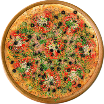 Основа: Традиционная (толстое тесто ⌀35см) (650 г) Соус: Соус красный (100 г) Топпинги: Балык (50 г), Сырное ассорти (50 г), Огурчики (50 г), Помидоры (50 г), Маслины (50 г) Доп. топпинги: Зелень (10 г), Чёрный перец (10 г)
