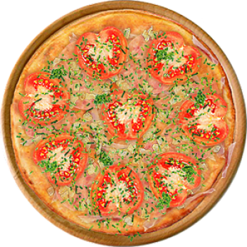 Основа: Итальянская (тонкое тесто ⌀35см) (400 г) Соус: Соус красный (100 г) Топпинги: Помидоры (50 г), Ветчина (100 г), Курица копченая (100 г), Сыр (100 г) Доп. топпинги: Зелень (10 г)
