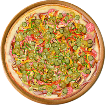 Основа: Итальянская (тонкое тесто ⌀35см) (400 г) Соус: Соус белый (100 г) Топпинги: Бекон (50 г), Ветчина (50 г), Копченые колбаски (50 г), Салями (50 г), Грибное ассорти (50 г), Болгарский перец (50 г), Халапеньо (50 г), Огурчики (100 г) Доп. топпинги: - нет -