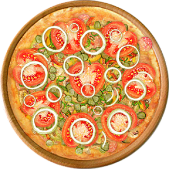 Основа: Традиционная (толстое тесто ⌀35см) (650 г) Соус: Соус красный (100 г) Топпинги: Ветчина (50 г), Копченые колбаски (50 г), Курица копченая (50 г), Салями (50 г), Шампиньоны (50 г), Сырное ассорти (50 г), Болгарский перец (50 г), Огурчики (50 г), Помидоры (50 г) Доп. топпинги: Лук репчатый (35 г)