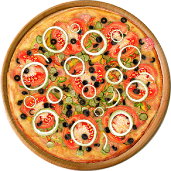Основа: Итальянская (тонкое тесто ⌀35см) (400 г) Соус: Соус красный (100 г) Топпинги: Ветчина (50 г), Копченые колбаски (50 г), Сырное ассорти (50 г), Болгарский перец (50 г), Огурчики (50 г), Помидоры (50 г), Маслины (50 г) Доп. топпинги: Лук репчатый (35 г)