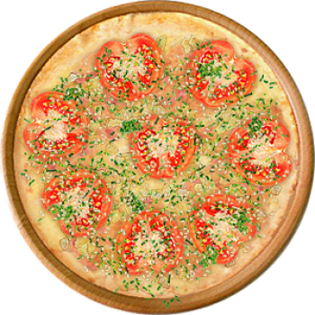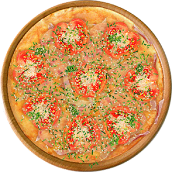 Основа: Традиционная (толстое тесто ⌀35см) (650 г) Соус: Соус красный (100 г) Топпинги: Бекон (50 г), Ветчина (50 г), Сырное ассорти (50 г), Помидоры (50 г) Доп. топпинги: Зелень (10 г), Кунжут (10 г)