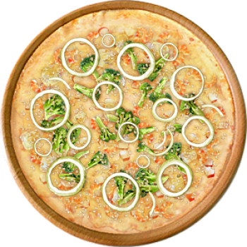 Основа: Традиционная (толстое тесто ⌀35см) (650 г) Соус: Соус белый (100 г) Топпинги: Брокколи (50 г), Крабовые палочки (100 г), Креветки (100 г), Сыр Филадельфия (100 г), Сырное ассорти (100 г) Доп. топпинги: Кунжут (10 г), Лук репчатый (35 г)