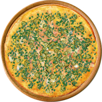 Основа: Итальянская (тонкое тесто ⌀35см) (400 г) Соус: Соус сырный (100 г) Топпинги: Балык (50 г), Грудинка (50 г), Сыр (50 г), Сыр Филадельфия (50 г), Сырное ассорти (50 г), Огурчики (50 г) Доп. топпинги: Лук зелёный (20 г)