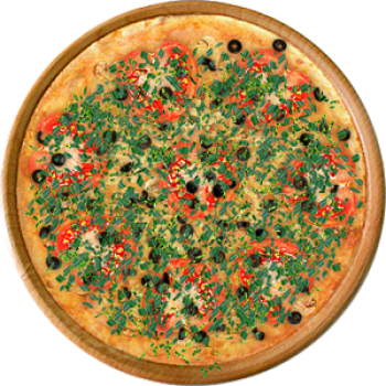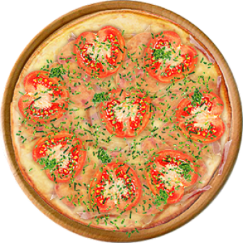 Основа: Традиционная (толстое тесто ⌀35см) (650 г) Соус: Соус красный (100 г) Топпинги: Сыр (50 г), Помидоры (50 г) Доп. топпинги: Зелень (10 г), Лук зелёный (20 г)