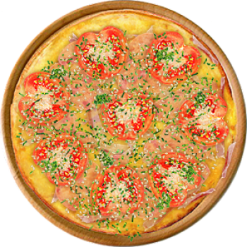 Основа: Традиционная (толстое тесто ⌀35см) (650 г) Соус: Соус красный (100 г) Топпинги: Ветчина (50 г), Сыр (50 г), Помидоры (50 г) Доп. топпинги: Зелень (10 г), Лук зелёный (20 г)