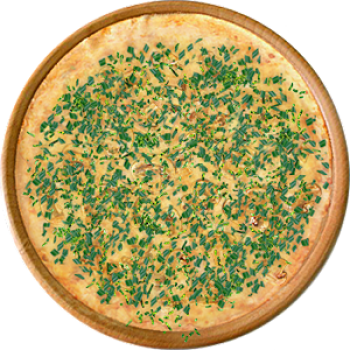 Основа: Традиционная (толстое тесто ⌀35см) (650 г) Соус: Соус белый (100 г) Топпинги: Шампиньоны (50 г), Сыр (50 г), Сырное ассорти (50 г) Доп. топпинги: Зелень (10 г), Лук зелёный (20 г)