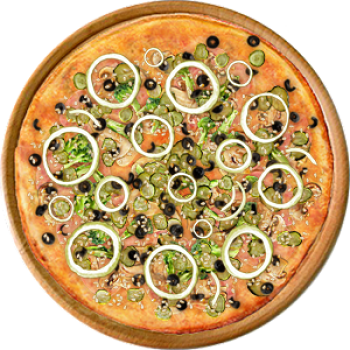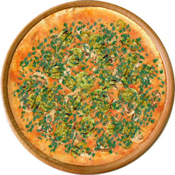 Основа: Традиционная (толстое тесто ⌀35см) (650 г) Соус: Соус красный (100 г) Топпинги: Шампиньоны (50 г), Халапеньо (50 г), Цукини (50 г), Сыр (100 г) Доп. топпинги: Лук зелёный (20 г)