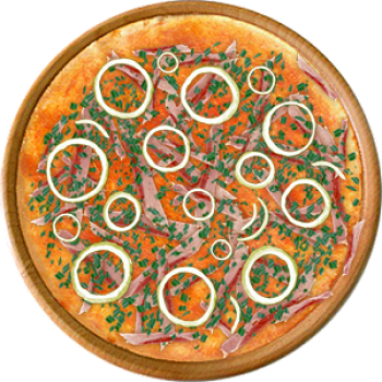Основа: Традиционная (толстое тесто ⌀35см) (650 г) Соус: Соус красный (100 г) Топпинги: Бекон (100 г) Доп. топпинги: Лук зелёный (20 г), Лук репчатый (35 г)